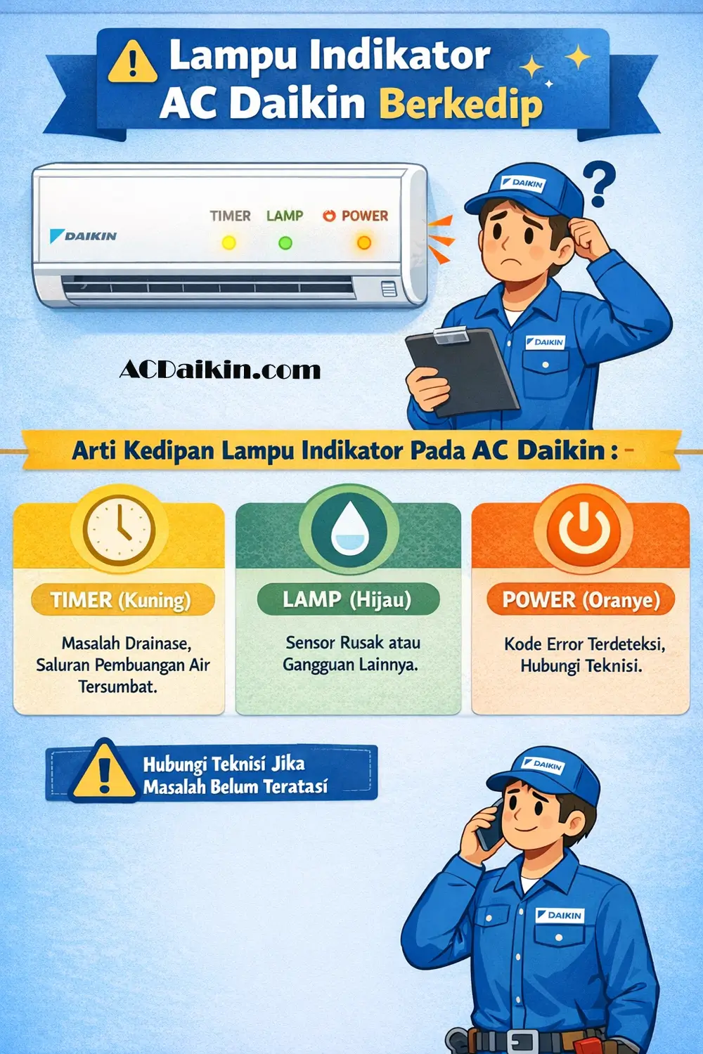 Catatan: Jika lampu yang berkedip adalah lampu Hijau (Power), itu barulah menandakan adanya kerusakan teknis (error). Namun, selama yang berkedip adalah warna oranye dan AC tetap dingin, itu murni hanya jadwal perawatan rutin saja.